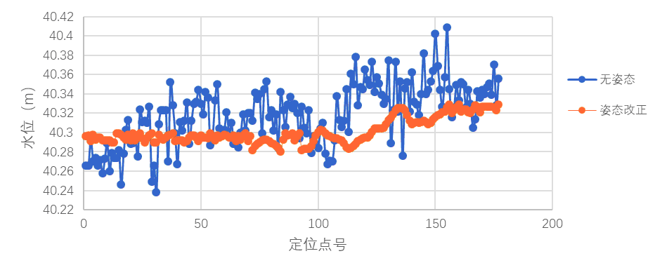 为了验证姿态改正对GNSS潮位值的影响情况,实验组对接入姿态仪的亿点通海洋测量软件,在数据后处理时分别进行姿态改正和不改正两种情况数据分析,取其中一个断面进行对比,其结果见图6所示。